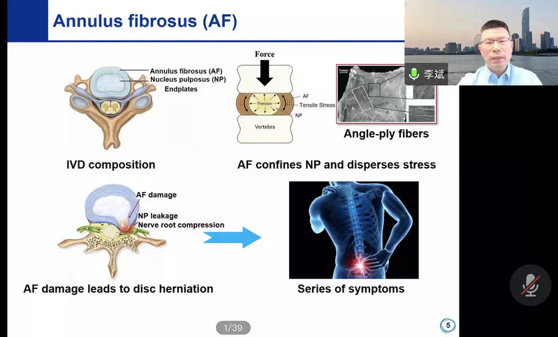 椎间盘的修复与再生是当今骨科医学研究的前沿热点。李斌教授首先向大家介绍了椎间盘的结构以及椎间盘退化所导致的临床症状。在椎间盘结构中,纤维环对于维持椎间盘的正常生物学功能起着至关重要的作用。但是,在椎间盘退变的过程中,纤维环组织会发生不可逆转的损伤,髓核突出导致临近神经受到压迫,造成腰痛、下肢麻木等一系列临床症状,严重的患者甚至会瘫痪。纤维环组织自愈能力有限,李斌教授团队在组织工程化纤维环修复方面做出了的大量研究。考虑到纤维环结构复杂,需要承受较大的力学载荷,李斌教授团队从材料与力学的角度出发,探究纤维环的复杂微观结构以及其在退变和再生过程中细胞功能的变化,探究多种力学信号对再生过程的影响及生物学机制,采用“材料与力学”相结合的策略,实现对细胞行为的精准调控,从而使纤维环功能性再生。