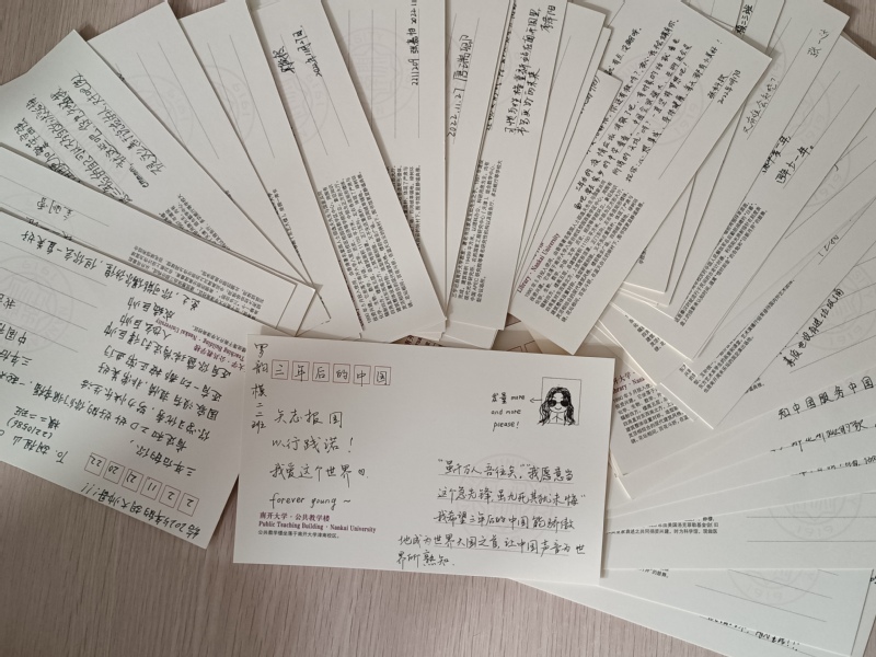 团日活动在全场合唱《歌唱祖国》中落下帷幕。活动结束后,2022级同学们纷纷在明信片上写下自己对于社会主义现代化强国建设的美好畅想和对未来的美好憧憬,以“时光信箱”的形式,寄给三年后的自己,让自己的文字穿越时空,等候未来的回答。