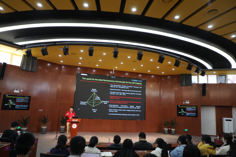 课程开始,陈良怡教授首先介绍了显微镜成像的原理,并结合瑞利判据详细解释了光学显微镜分辨率受限的原因。如何提高分辨率?能否用超分辨率显微镜观察活细胞?超分辨率显微镜的开发面临着光毒性、速度慢、操作复杂、不通用等重重困难,“没有十全十美的工具,只有最适宜于当前应用场景的仪器”。围绕着活细胞超分辨率成像技术这一话题,陈良怡教授通过两个自己的科研工作——海森解卷积超分辨成像与稀疏解卷积数学超分辨率成像的故事介绍了自己实验室的研究经历并生动地为同学们展示了真正的科研工作的艰辛与收获。
