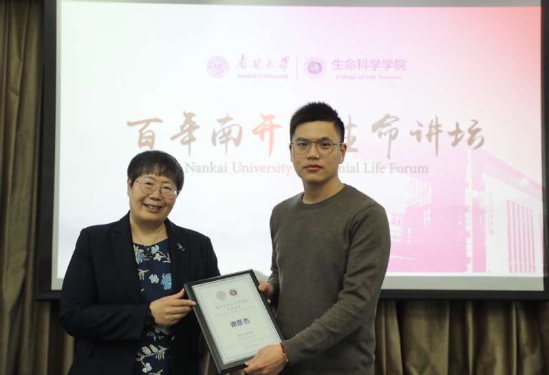 2023年3月23日,应k1体育邀请,南京农业大学谢彦杰教授做客“百年南开之生命讲坛”,在生物站报告厅开展了以“硫化氢在植物ABA信号中的功能”为主题的学术报告。报告开始前,王宁宁教授向大家介绍了谢彦杰教授的研究经历及主要研究成果,并为其颁发了“百年南开之生命讲坛”主讲人纪念牌。