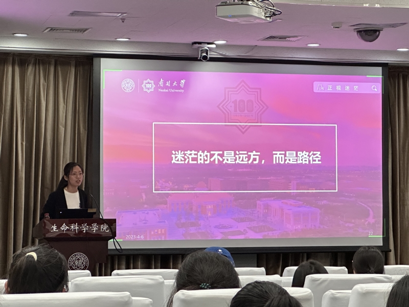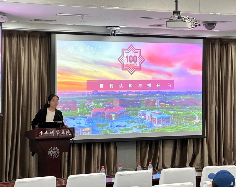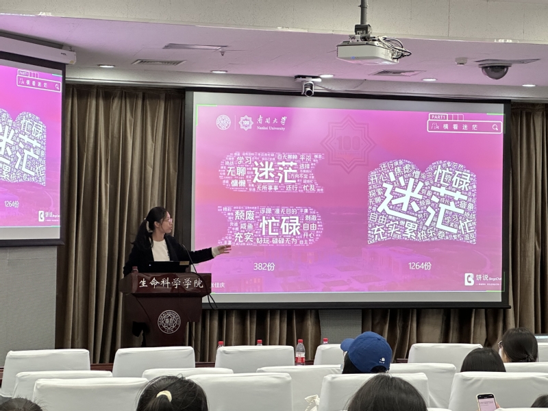 谈及自我认知与提升的关系,王一涵利用生物知识形象地展示了认识自我、提升自我的关系,正如DNA的双螺旋一般互相关联,而采取的行动就像“氢键”来将二者紧密连接起来。除此之外,王一涵还讲述了周总理、毛主席、鲁迅、马克思等伟人也曾经历过迷茫的故事,介绍了几位优秀学长学姐的逆袭实例,再次证明了迷茫的必然性以及行动的必要性,指出“寻找目标本身就是大学的目标”,鼓励大家正视迷茫,感受行动的力量。